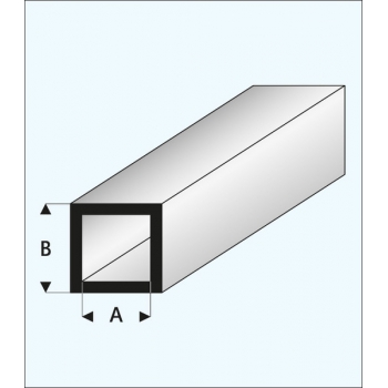 Hochwertiges Vierkantrohr von MAQUETT. Technische Daten: Material: weißes Styrol Durchmesser A: 2,0 mm Durchmesser B: 4,0 mm Länge: 1000 mm Herstellerbezeichnung: 420-52